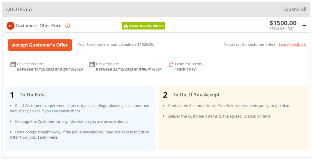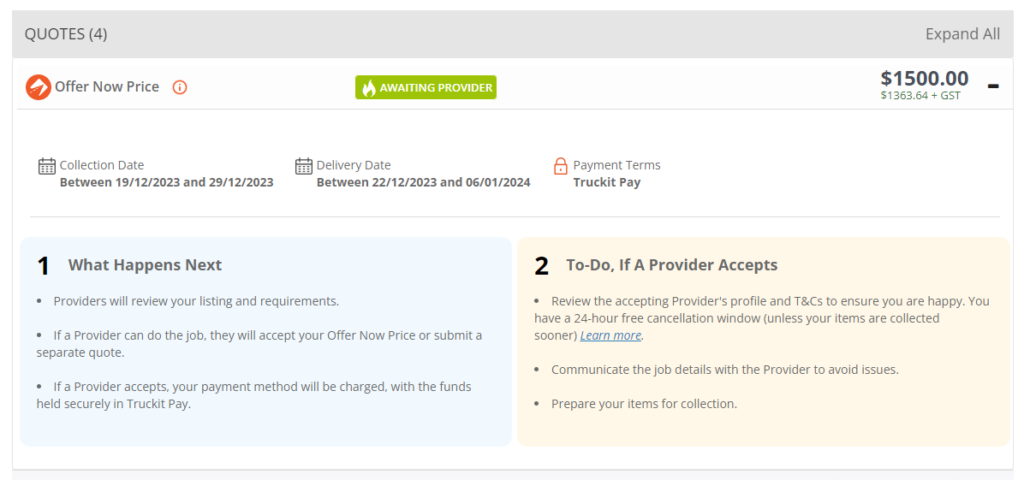A new feature was recently launched on Truckit.net that allows Customers to Offer a price to Providers to instantly accept. If Providers don't like the Customer's Price they can still submit their own quote(s). As with normal Listings, only one Provider can accept the Customer's Offer and book the Job.
